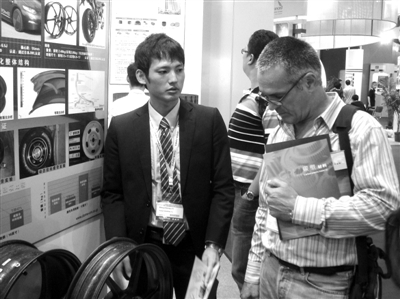 日本東麗公司是全球領(lǐng)先的碳纖維生產(chǎn)商,其產(chǎn)品是不少國內(nèi)外客戶的首選。圖為日前在北京舉行的2010第十六屆中國國際復(fù)合材料工業(yè)技術(shù)展覽會上,一位美國采購商與東麗公司日本技術(shù)人員正洽談碳纖維業(yè)務(wù)。                (本報(bào)記者 徐巖 攝)