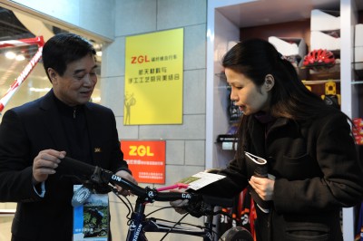 中復(fù)神鷹碳纖維有限公司董事長(zhǎng)張國(guó)良(左)為本報(bào)記者介紹用我國(guó)自主生產(chǎn)的碳纖維制造的自行車(chē)。