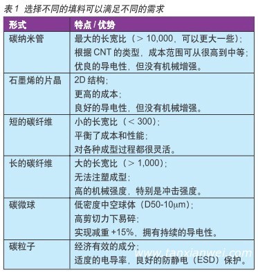 碳的加入可以是多種形式:作為碳納米管(CNT)、石墨烯的片晶、短或長(zhǎng)的碳纖維、碳微球和簡(jiǎn)單的碳粒子。表1總結(jié)了這些形式各自的優(yōu)勢(shì)。這些填充材料使塑料可以導(dǎo)電,以提供EMI屏蔽。大部分CNT填充塑料的電阻率能小于10嗎?以厘米計(jì),在1%至5%的填料體積和1以下?以厘米計(jì),填料體積在5%至10%。有時(shí)候,可以通過(guò)碳系填料金屬涂層來(lái)增加導(dǎo)電性。