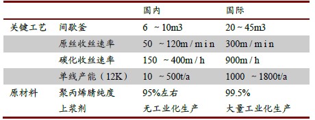 表1:國(guó)內(nèi)國(guó)際碳纖維工藝差距