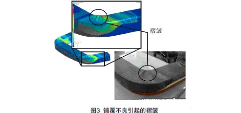 預浸料在曲面上的鋪覆過程會對增強體造成剪切和擠壓,從而導致纖維鋪設角度發(fā)生變化,當剪切角超過預浸料的極限角時甚至可能引起褶皺(圖3)。纖維角度的 變化會引起局部熱膨脹系數(shù)和模量的改變,從而對最終的翹曲變形和殘余應力分布造成影響。顯然,鋪覆作用的影響程度受工件幾何形貌的影響,對于曲率較大的工 件,這種作用的影響相對顯著。