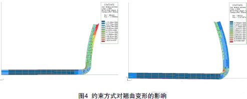 在固化變形分析中,熱膨脹與固化收縮決定了預浸料應變能的水平,而預浸料的約束方式則直接決定了殘余應力在結(jié)構(gòu)上的分布狀態(tài)。殘余應力在厚度方向上分布的 不平衡導致了結(jié)構(gòu)的翹曲變形。圖4為采用相同預浸料,經(jīng)歷相同的溫度歷程,在不同約束方式下的兩個L型件的變形計算結(jié)果。左圖L 型件外側(cè)施加全約束,固化結(jié)束后釋放約束;右圖L型件內(nèi)側(cè)施加全約束,固化結(jié)束后釋放約束。可見,采用不同的約束方式將顯著影響最終的變形結(jié)果。