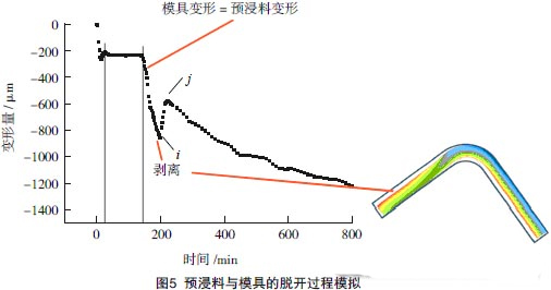 在實際情況中,隨著溫度的下降,由于工件與模具的熱膨脹系數(shù)差別,金屬模具的收縮明顯大于工件,從而在工件與模具的接觸表面產(chǎn)生剪切應力[8]。當剪切應 力超過某一閾值時,工件與模具脫開,局部剪切應力釋放。圖5為工件與模具脫開過程的模擬。位移曲線的第一階段斜率較大,這是因為金屬的熱膨脹率較大,模具 與工件貼合在一起。當達到脫開點時,位移發(fā)生劇烈變化,之后位移隨時間的斜率較平穩(wěn),表征復合材料較小的熱膨脹率。