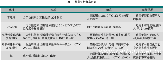 用作復(fù)合材料成型模具的材料主要有普通鋼、INVAR鋼、復(fù)合材料(雙馬和環(huán)氧樹脂)、鋁等。通常根據(jù)材料的性能(主要是高溫下的熱膨脹系數(shù))、成本、周期及使用次數(shù)來選擇,見表1。 123,123