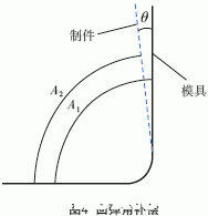 除模具的膨脹對制件固化變形有影響外,復(fù)合材料制件因?yàn)殇亴雍徒Y(jié)構(gòu)的不對稱性,以及材料本身的固化特性,在固化時(shí)產(chǎn)生內(nèi)應(yīng)力也將引起制件變形。而對于梁、長桁類有大夾角的零件,固化變形最顯著的是回彈角,即制件在固化脫模后,夾角因收縮而小于模具角度,此差值為回彈角。如圖4所示,A1為模具夾角,A2為制件脫模后的夾角,θ為二者之差,即回彈角。在設(shè)計(jì)時(shí),不考慮回彈角或考慮不當(dāng),將對制件質(zhì)量產(chǎn)生較大影響,特別是對裝配的影響。