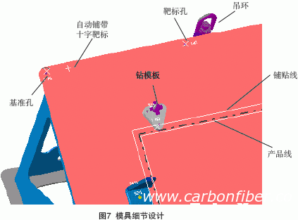 (4) 靶標(biāo)孔:用于手動鋪貼時(shí)放置激光投影的靶標(biāo),以定位鋪層區(qū)域。靶標(biāo)孔按實(shí)測值即可,坐標(biāo)值刻于模具上。