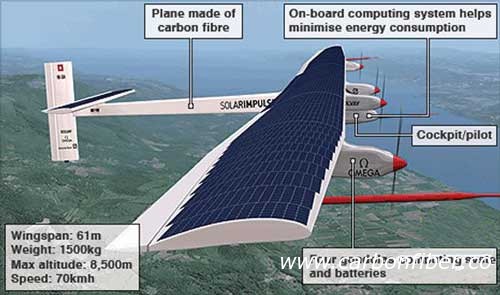 “陽光動力號”飛機原型的機翼類似空客A340,長63.4米,其上集成了200平方米的光伏電池面板,由12000塊厚度僅為180微米的單晶硅光伏電池板組成,晝夜均可飛行。飛機主架結構采用含碳素纖維和蜂巢的復合材料,以三明治式夾層法壓制合成,機身僅重1500公斤,比傳統(tǒng)飛機輕1600公斤 “陽光動力號”于21日開始在瑞士東部迪本多爾夫進行模擬飛行。項目團隊聲稱,這次測試將由項目聯(lián)合創(chuàng)始人和飛行員來評估駕駛艙的配置和飛行數(shù)天對人體的影響。這架覆蓋著光伏電池、僅由太陽能提供動力的太陽能樣機曾于2011年年中在歐洲完成了一系列飛行,并且還在布魯塞爾和巴黎航空展上亮過相。