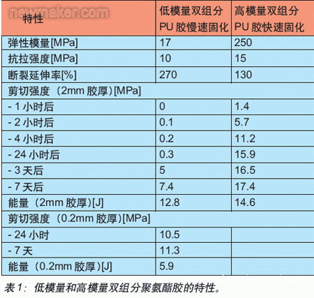 在汽車組裝過程中粘結(jié)部件時,雙組分聚氨酯結(jié)構(gòu)膠比較合適。這種膠可以加工成具有不同模量和斷裂伸長率。表1列出了兩種硬化率不同、彈性模量有低有高的雙組分聚氨酯結(jié)構(gòu)膠的性能曲線。