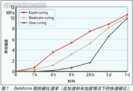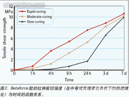 在標(biāo)準氣候條件下,兩小時后沒有達到該拉伸剪切強度值。但是在加速條件下,1小時候即測得了達3.5MPa。樣本儲存于室溫條件下,強度僅為0.7 MPa。三天后,采用加速膠黏劑,達到了最終強度10.5MPa,而未經(jīng)加熱反應(yīng)的樣本,在7天后方達到該強度。