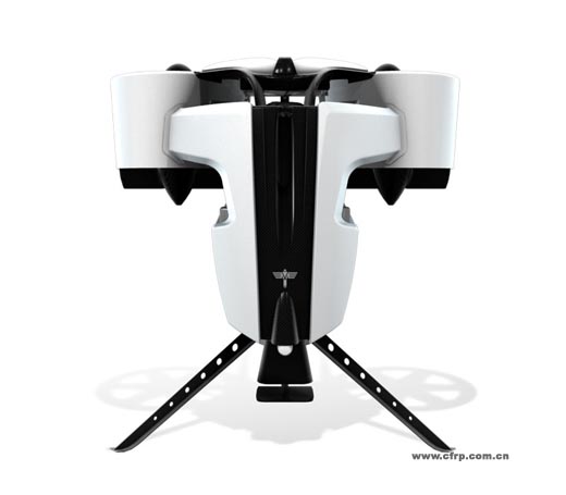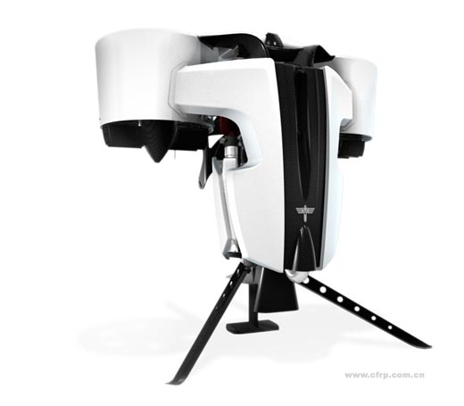 在Jetpack上,旋翼安裝在兩個桶狀的結構當中。這種涵道式設計比直升機那種開放式設計效率更高。而發(fā)動機、燃料箱安裝在旋翼中間下方的位置,以防止飛行時重心過高而翻轉。整套設備大多數(shù)零件都采用碳纖維、杜邦公司的凱夫拉材料和其他高強度聚合物制造,減低重量的同時保證強度,讓整套裝置在每分鐘6000轉的情況下依然能夠保持足夠的穩(wěn)固。