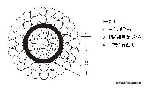 光纖復(fù)合架空地線(OPGW)是架空導(dǎo)線和光纖的復(fù)合體,具有傳輸電能和通信的雙重功能。隨著碳纖維復(fù)合材料在架空導(dǎo)線的應(yīng)用,光纖復(fù)合架空地線中使用碳纖維復(fù)合材料也將是指日可待的事情。由于碳纖維復(fù)合材料取代了鍍鋅鋼線或鋁包鋼線,這種新型的光纖復(fù)合架空地線也具有重量輕、強(qiáng)度高、低弛度、耐腐蝕、低線損的特點(diǎn)。碳纖維復(fù)合材料的優(yōu)勢(shì)突出體現(xiàn)它在大截面、大芯數(shù)的OPGW中的應(yīng)用。下面是這種使用新材料的OPGW的結(jié)構(gòu)圖。
