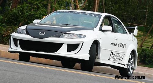 馬自達6改裝的碳纖維引擎蓋上的兩個網(wǎng)狀出氣口更是如虎添翼,如同黑馬的兩個鼻孔。 123,123