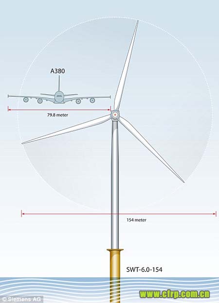 報道稱,這座目前世界上最大的風車是由德國西門子公司開發(fā)的大型風力發(fā)電機,擁有三片長度達到75米的扇葉,僅僅比空客公司的巨無霸客機A380的翼展(79.8米)略短。報道稱,這座大風車將于2014年矗立在臨近英國埃塞克斯郡海岸的水中。