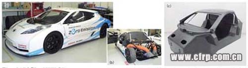 在賽車及跑車中使用最多的是將預(yù)浸料層疊并利用熱壓使其固化的熱塑性CFRP。比如,日產(chǎn)汽車的“LEAF”(中國(guó)名:聆風(fēng))的馬達(dá)、再比如將減速機(jī)中置的EV賽車“LEAF NISMO RC”演示款都使用預(yù)浸料制造了從駕駛室到通風(fēng)罩的絕大部分部件(圖1)。