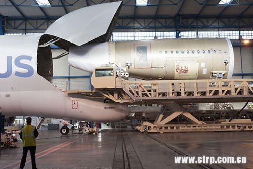 2012年4月25日,用于對A350XWB寬體飛機進行靜態(tài)結(jié)構(gòu)測試的飛機后端機身抵達總裝線,空客A350XWB后機身段長20米,采用的是碳纖維復(fù)合材料,由機身尾段和四塊后機身蒙皮組成。(如圖)