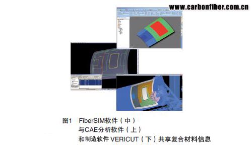如圖1 所示,在CATIA V5 設計進程中,VISTAGY 的FiberSIM® 軟件、應力分析的MSC 軟件SimXpert 有限元模型、用于為自動鋪絲機生成制造數(shù)據(jù)的CGTech VERICUT 復合材料編程及仿真軟件無縫共享復合材料機身壁板的鋪層信息。