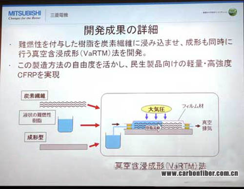 三菱電機采用的是稱為真空輔助樹脂轉(zhuǎn)移成型(VaRTM)法的工藝:將置于模具上的碳纖維用薄膜材料密封起來,邊向模具和薄膜材料之間注入樹脂邊減壓,使其在大氣壓下成型。樹脂采用了通用的阻燃性乙烯酯。雖然VaRTM法早已是廣為人知,但樹脂的流動及纖維配向控制,以及在碳纖維中夾入隔熱材料等其他材料等的“生產(chǎn)技術(shù)的提高,才使得其能適用于消費類產(chǎn)品”。該公司已將CFRP應(yīng)用于人造衛(wèi)星,但人造衛(wèi)星用CFRP需要用熱壓罐對預(yù)浸料進(jìn)行加熱加壓等,存在預(yù)浸料及熱壓罐設(shè)備導(dǎo)致成本上升的難題。
