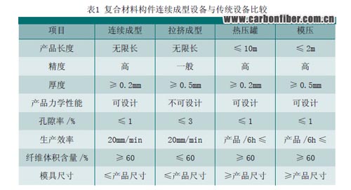復(fù)合材料連續(xù)成型設(shè)備與傳統(tǒng)成型設(shè)備的比較見表1。連續(xù)成型設(shè)備不受場(chǎng)地和模具的限制,可在小型模具上通過連續(xù)固化成型生產(chǎn)大型、超長(zhǎng)復(fù)合材料構(gòu)件。另外,該設(shè)備可通過成型前的自動(dòng)裁剪-鋪疊系統(tǒng),實(shí)現(xiàn)具有鋪層設(shè)計(jì)的復(fù)合材料構(gòu)件的連續(xù)生產(chǎn),這與傳統(tǒng)的拉擠設(shè)備不同,同時(shí)可控制復(fù)合材料構(gòu)件的纖維體積含量。