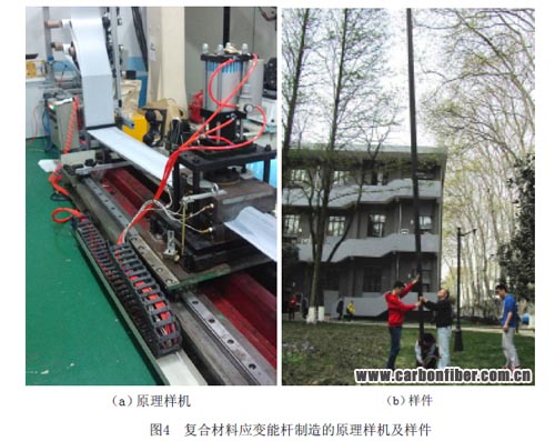 南京航空航天大學(xué)在復(fù)合材料構(gòu)件連續(xù)成型技術(shù)方案的基礎(chǔ)上初步研制了復(fù)合材料應(yīng)變能桿成型的原理樣機(jī)(圖4(a)),并試制了20m長(zhǎng)應(yīng)變能桿(圖4(b))。
