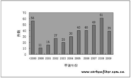 圖1 2009年以前我國(guó)碳纖維專利申請(qǐng)情況