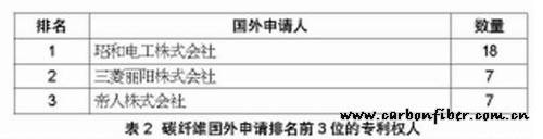 與之相反的是,國(guó)外申請(qǐng)人中位于前三位的均為日本企業(yè),大型纖維、化工企業(yè)是碳纖維研究進(jìn)展的主導(dǎo)力量。目前,在碳纖維領(lǐng)域,日本企業(yè)占有市場(chǎng)份額最大,關(guān)鍵技術(shù)主要掌握在東麗公司、東邦Tenax集團(tuán)和三菱人造絲集團(tuán)手中,其他碳纖維企業(yè)多處于成長(zhǎng)階段,生產(chǎn)工藝正在摸索中不斷完善。從專利申請(qǐng)數(shù)量上看,以昭和電工株式會(huì)社最多(Showa Denko)(見(jiàn)表2)。
