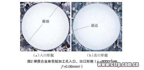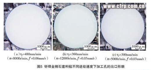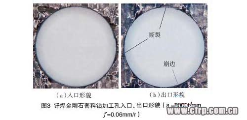 (1)釬焊金剛石套料鉆加工孔的入口質(zhì)量比出口質(zhì)量好,硬質(zhì)合金麻花鉆入口質(zhì)量比出口質(zhì)量差。釬焊金剛石套料鉆加工孔出現(xiàn)撕裂缺陷的臨界進(jìn)給速度比硬質(zhì)合金麻花鉆大。因而,釬焊金剛石套料鉆具有更高的加工效率。