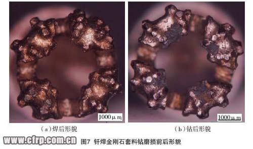 CFRP材料難加工特性之一就是刀具磨損嚴(yán)重,刀具耐用度低。圖6為硬質(zhì)合金麻花鉆磨損前后的形貌圖。從圖中可以明顯看到,硬質(zhì)合金麻花鉆的前刀面出現(xiàn)嚴(yán)重的崩刃和磨損。另外,主切削刃和副切削刃及橫刃都出現(xiàn)不同程度的磨損和崩刃。圖7為釬焊金剛石套料鉆磨損前后的形貌。如圖7(b)所示,鉆頭上的金剛石磨粒均未出現(xiàn)脫落現(xiàn)象,只是鉆頭斷面內(nèi)側(cè)倒角處的釬料被磨掉很多。這是因為試驗所用釬焊金剛石套料鉆是利用高溫釬焊工藝使金剛石與基體材料實現(xiàn)結(jié)合的,由于此高溫釬焊技術(shù)實現(xiàn)了金剛石、釬料和金屬基體界面上的化學(xué)冶金結(jié)合[8], 因此該鉆頭上的金剛石磨粒具有高結(jié)合強(qiáng)度和耐磨性。
