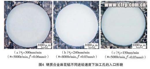 圖4為不同進(jìn)給速度vf下硬質(zhì)合金麻花鉆加工孔的入口形貌圖。從圖4(a)~(c),進(jìn)給速度分別為300mm/min、240mm/min及150mm/min,孔入口形貌分別為出現(xiàn)較大撕裂、有崩邊無撕裂、無缺陷。由此可見,硬質(zhì)合金麻花鉆加工CFRP 時,進(jìn)給速度240mm/min 為一個臨界值,當(dāng)進(jìn)給速度大于該值時,將會出現(xiàn)撕裂缺陷;當(dāng)進(jìn)給速度小于該值時,無撕裂產(chǎn)生,得到好的孔入口質(zhì)量。