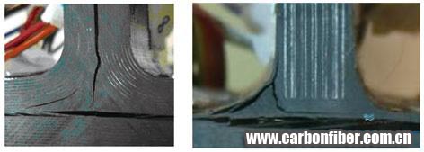 在整體化結(jié)構(gòu)接頭內(nèi)部,由于載荷傳遞路徑的特殊性,有可能形成不容忽視的層間應(yīng)力區(qū)(包括層間正應(yīng)力和層間剪切應(yīng)力)。該區(qū)層間應(yīng)力在量值上可能小于結(jié)構(gòu)承受的面內(nèi)應(yīng)力,但由于復(fù)合材料對(duì)層間應(yīng)力的敏感性,破壞則往往由此開(kāi)始產(chǎn)生(圖2)。層間應(yīng)力導(dǎo)致的破壞模式是整體化結(jié)構(gòu)接頭的一個(gè)重要力學(xué)行為特點(diǎn)。有關(guān)接頭承載能力的評(píng)估需給予特殊關(guān)注。