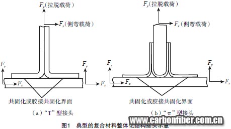 復(fù)合材料結(jié)構(gòu)件中,不同結(jié)構(gòu)組分可通過(guò)共固化或膠接共固化途徑結(jié)為一體,以取代緊固件連接方式。此狀態(tài)下,在共固化或膠接共固化界面周邊,形成一個(gè)特殊的接頭區(qū)。所謂復(fù)合材料整體化結(jié)構(gòu),即為內(nèi)含此類(lèi)接頭的復(fù)合材料結(jié)構(gòu)型式,圖1給出了典型接頭及其載荷示意。