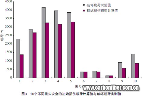 以初始損傷載荷還是破壞載荷來(lái)表征接頭的承載能力,也是接頭力學(xué)行為模擬涉及的一個(gè)具體問(wèn)題。對(duì)破壞載荷的預(yù)測(cè)不存在特殊的技術(shù)困難。實(shí)際上,描述復(fù)合材料破壞過(guò)程的各種算法模型在許多工作中得到應(yīng)用。但時(shí)間耗費(fèi)是破壞載荷計(jì)算的一個(gè)主要問(wèn)題。當(dāng)分析目標(biāo)是一個(gè)給定的結(jié)構(gòu)案例時(shí),計(jì)算時(shí)間的影響作用并不凸現(xiàn)。但當(dāng)分析目標(biāo)是結(jié)構(gòu)參數(shù)變化的影響作用評(píng)估或結(jié)構(gòu)方案的優(yōu)化時(shí),由于涉及大量案例的反復(fù)計(jì)算,采用破壞載荷作為承載能力表征會(huì)使計(jì)算時(shí)間的耗費(fèi)變得難以接受。在這種情況下,建議采用初始損傷載荷作為目標(biāo)函數(shù)。初始損傷載荷和破壞載荷分別處于破壞過(guò)程兩端,一般情況下兩者之間會(huì)存在差異,差異的幅度也隨結(jié)構(gòu)參數(shù)和載荷條件的不同而變化。但就結(jié)構(gòu)方案的比較而言,初始損傷載荷的計(jì)算值可以切實(shí)反映承載能力的優(yōu)劣狀況。圖3給出一系列不同形式、不同參數(shù)、不同載荷形式的接頭案例,由試驗(yàn)測(cè)得的破壞載荷與通過(guò)計(jì)算得到的初始損傷載荷。從圖3可見(jiàn),在案例承載能力的橫向比較上,初始損傷載荷計(jì)算值和破壞載荷實(shí)測(cè)值反映了基本一致的優(yōu)劣態(tài)勢(shì)。