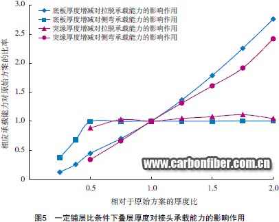 圖5為一原始接頭方案,在給定鋪層比條件下增減其填充區(qū)周邊突緣疊層厚度或底板疊層厚度,承載能力所受影響作用的模擬結(jié)果??梢钥吹?,接頭結(jié)構(gòu)參數(shù)在一定范圍內(nèi)變化可對(duì)承載能力形成顯著影響,并且影響作用會(huì)隨載荷形式的不同而發(fā)生明顯差異。由于本文的綜述性質(zhì),此處不對(duì)影響作用的具體細(xì)節(jié)進(jìn)行討論,僅通過(guò)圖例表明其復(fù)雜性。同時(shí)表明,對(duì)于接頭的合理設(shè)計(jì),模擬結(jié)果可提供方向性的參數(shù)修正依據(jù)。