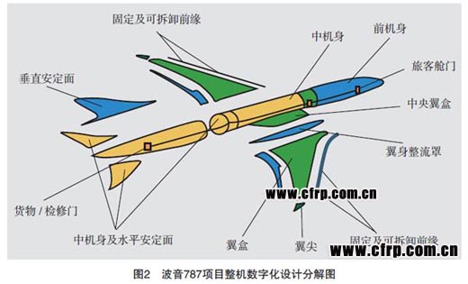 波音公司在與國內(nèi)主機(jī)廠合作生產(chǎn)的波音737、747、787 系列飛機(jī)的翼身整流罩、內(nèi)襟翼均采用CATIA CPD 模塊數(shù)字化設(shè)計(jì)制造完成[3]。波音787復(fù)合材料構(gòu)件重量占全機(jī)結(jié)構(gòu)重量的50%左右, 是迄今為止復(fù)合材料用量最多的一個(gè)機(jī)型: 其機(jī)身、機(jī)尾翼采用碳纖維層合結(jié)構(gòu);而升降舵、方向舵卻保留了過去采用的碳纖維夾芯結(jié)構(gòu); 發(fā)動(dòng)機(jī)艙除受力大的發(fā)動(dòng)機(jī)吊架外均采用碳纖維夾芯結(jié)構(gòu); 整流罩采用玻璃纖維夾芯結(jié)構(gòu)。其復(fù)合材料件的生產(chǎn)分布在全世界各地進(jìn)行, 而且采用了許多新工藝、新設(shè)備和新材料。其中復(fù)合材料的數(shù)字化設(shè)計(jì)制造是復(fù)合材料零部件制造的主要設(shè)計(jì)手段。具體的應(yīng)用實(shí)例如圖1、圖2所示。