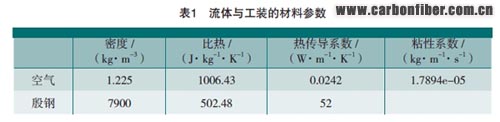 由經(jīng)驗(yàn)和工藝試驗(yàn)可知工裝的變形均在毫米量級,工裝的尺寸在幾米至十幾米,工裝結(jié)構(gòu)變形不會(huì)對熱壓罐內(nèi)的氣體流動(dòng)產(chǎn)生明顯影響。由于流體計(jì)算對網(wǎng)格要求較高,文中使用專業(yè)流體仿真軟件FLUENT進(jìn)行工裝及熱壓罐內(nèi)整個(gè)流場的網(wǎng)格劃分,如圖3所示。對工裝建立的有限元模型既可以適用于溫度場的計(jì)算,也可以用于工裝的結(jié)構(gòu)變形計(jì)算。熱壓罐工藝規(guī)范簡化如圖4所示,溫度場計(jì)算所用相關(guān)材料參數(shù)如表1所示。