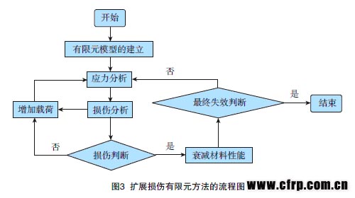 挖補(bǔ)修理有限元研究方法在過去的20年里取得了很大的發(fā)展。已經(jīng)從過去簡單的2維研究發(fā)展為3維有限元仿真研究。材料的失效判斷也從過去簡單判斷破壞與否的蔡-吳、蔡-希爾失效判據(jù)發(fā)展完善為目前常采用的能夠區(qū)分材料多種不同失效模式(纖維斷裂、基體開裂、纖維-基體剪切破壞和分層破壞)的Hashin失效判據(jù)。目前,修理結(jié)構(gòu)有限元仿真研究的最常用方法為擴(kuò)展損傷方法。圖3即為擴(kuò)展損傷方法的運(yùn)算流程圖。 copyright 123456