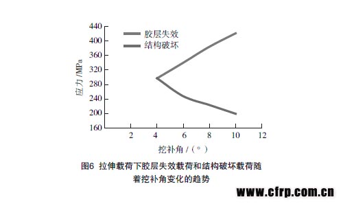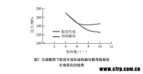 隨著挖補(bǔ)修理研究的不斷發(fā)展,目前最新的研究結(jié)果表明:挖補(bǔ)修理結(jié)構(gòu)的失效包括膠層的失效和結(jié)構(gòu)的破壞,而挖補(bǔ)角對膠層失效和結(jié)構(gòu)破壞的影響并不相同。如圖6所示,隨著挖補(bǔ)角度的增大,膠層的失效載荷在不斷減少而結(jié)構(gòu)的破壞載荷卻在不斷增加。4°時(shí)膠層的失效載荷與結(jié)構(gòu)的破壞載荷相同,此時(shí)的角度即為拉伸載荷下挖補(bǔ)修理的最佳挖補(bǔ)角。通過研究,同樣也可以得到壓縮載荷下膠層失效和結(jié)構(gòu)破壞載荷隨挖補(bǔ)角變化的趨勢(圖7),并得到壓縮載荷下挖補(bǔ)修理的最佳挖補(bǔ)角6°。與試件受到單一拉伸載荷或壓縮載荷不同,一般實(shí)際修理結(jié)構(gòu)使用時(shí)即會(huì)受拉伸載荷也會(huì)受壓縮載荷,因此綜合考慮可以得到飛機(jī)修理結(jié)構(gòu)的最佳挖補(bǔ)角為6°。