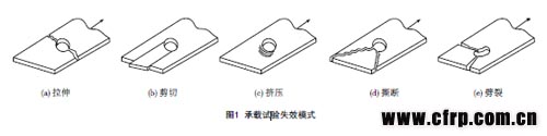 其中拉伸失效、剪切失效以及擠壓失效是因承受面內(nèi)載荷而發(fā)生的;當(dāng)承受面外載荷時(shí),緊固件還可能從接頭中拉出,即所謂的“拉脫”。層板的拉伸失效與基體和纖維的拉伸失效有關(guān),通常發(fā)生于寬徑比很小,或者旁路載荷與緊固件承載比較大時(shí)。剪切破壞和擠壓破壞則主要是由纖維和基體的壓縮破壞引起的。拉伸破壞與剪切破壞是災(zāi)難性的,而擠壓破壞則是隨載荷和時(shí)間慢慢累積的,是結(jié)構(gòu)局部的失效,不會(huì)帶來(lái)結(jié)構(gòu)的災(zāi)難性破壞[8]。在以上幾種破壞模式的基礎(chǔ)上,隨載荷及時(shí)間的變化,當(dāng)結(jié)構(gòu)擠壓破壞后,還可能發(fā)生一系列后續(xù)的破壞[9],如圖1中的(d)和(e)所示。實(shí)際應(yīng)用中復(fù)材接頭可能存在多種破壞模式,發(fā)生混合破壞,使得接頭設(shè)計(jì)和分析更加困難[10]。