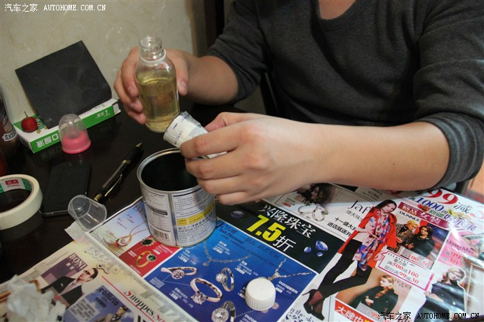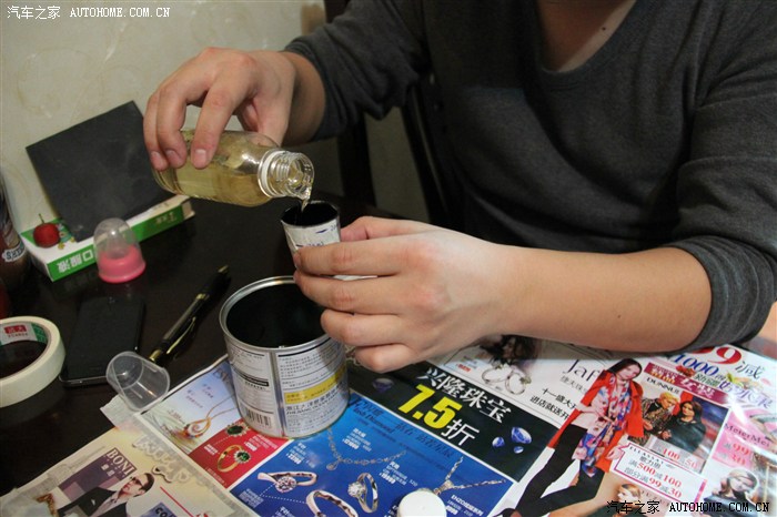 開始調(diào)配環(huán)氧樹脂膠,樹脂和固化劑的比例也要弄清楚,攪拌好之后,拿一個(gè)新刷子就可以刷膠了,刷環(huán)氧樹脂可以不用等,直接刷就是了,注意下面要用東西鋪好,膠會(huì)滴下來的。