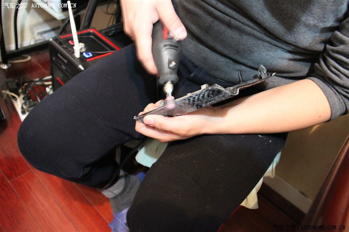 又經(jīng)過一夜加一白天的等待,樹脂層也干透了,電磨工具就可以派上用場了,首先用剪刀把能剪的多余地方都剪掉,然后用電磨加上砂輪片摳孔和打磨邊緣。