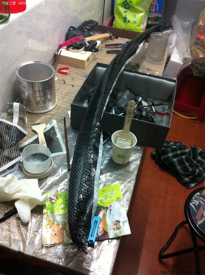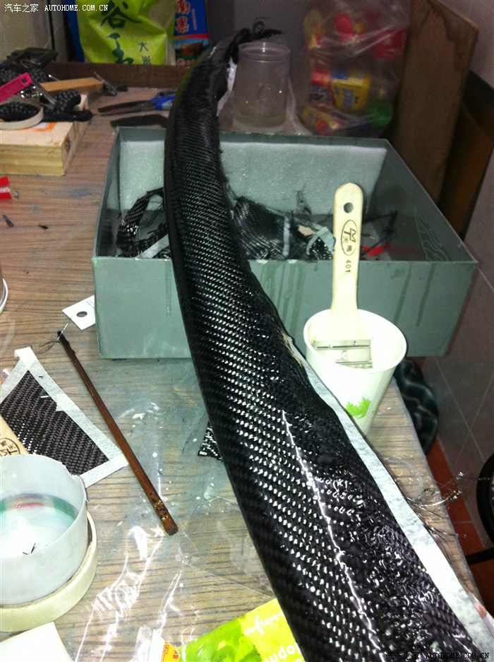 “車禍現(xiàn)場”兄弟,請(qǐng)看下面的幾個(gè)照片,尾翼制作過程中,包的雙層碳纖維,樹脂要刷好幾遍呢,這是第二層的第二遍,預(yù)計(jì)還要一周時(shí)間。